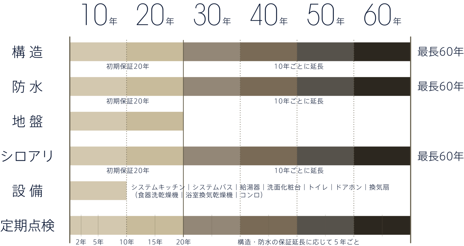 その後は、5年・10年・15年・20年と点検を重ね、保証を延長される場合は、5年ごとに最長60年まで定期点検を行います。