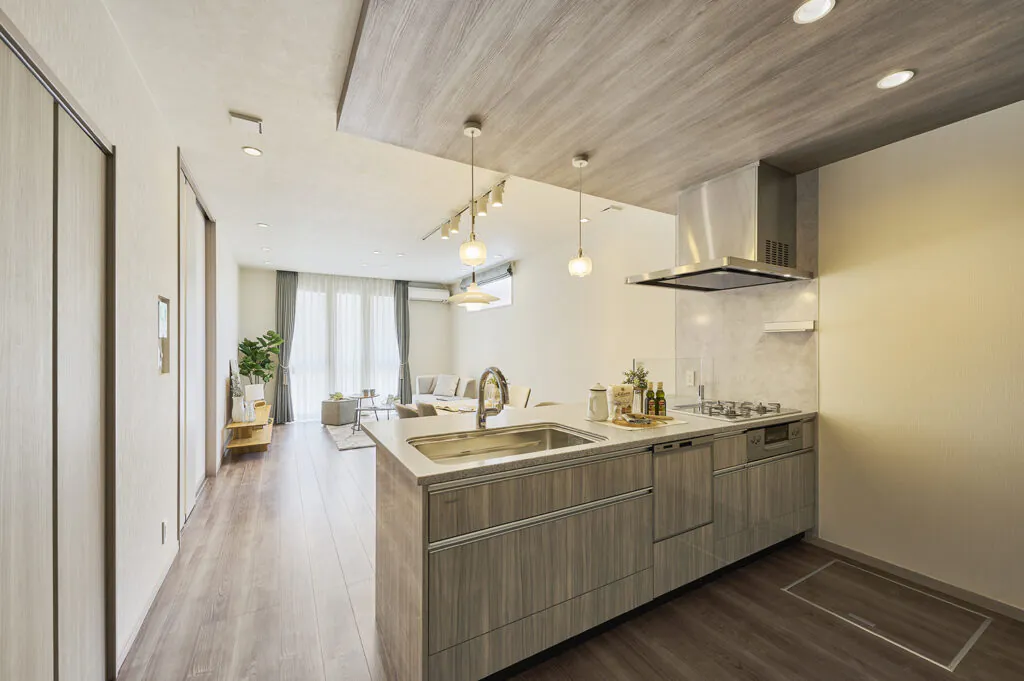 まずご紹介するのは、南向きの明るいLDKに設けられた、どこまでも開放的なフルフラットの対面キッチンです。
