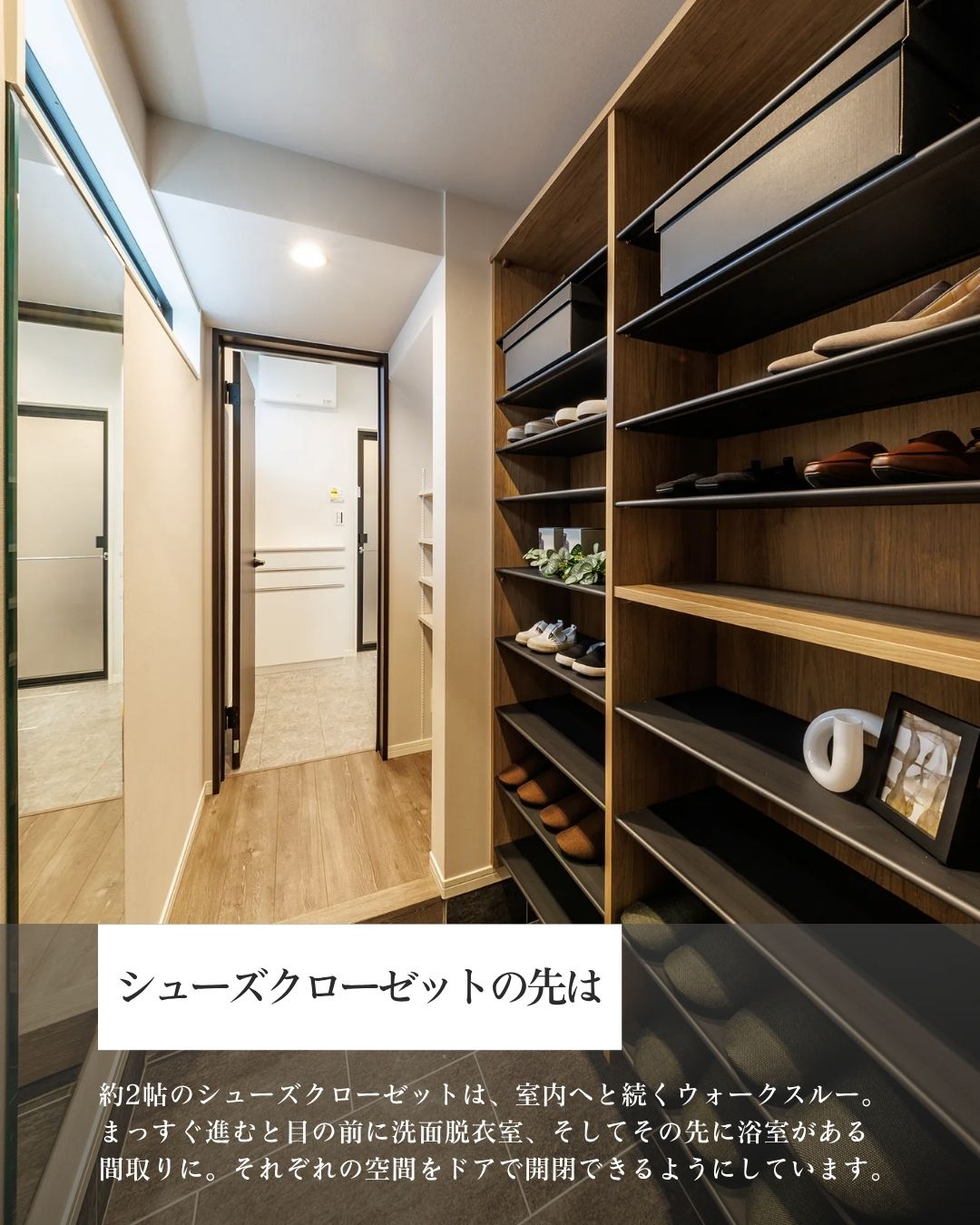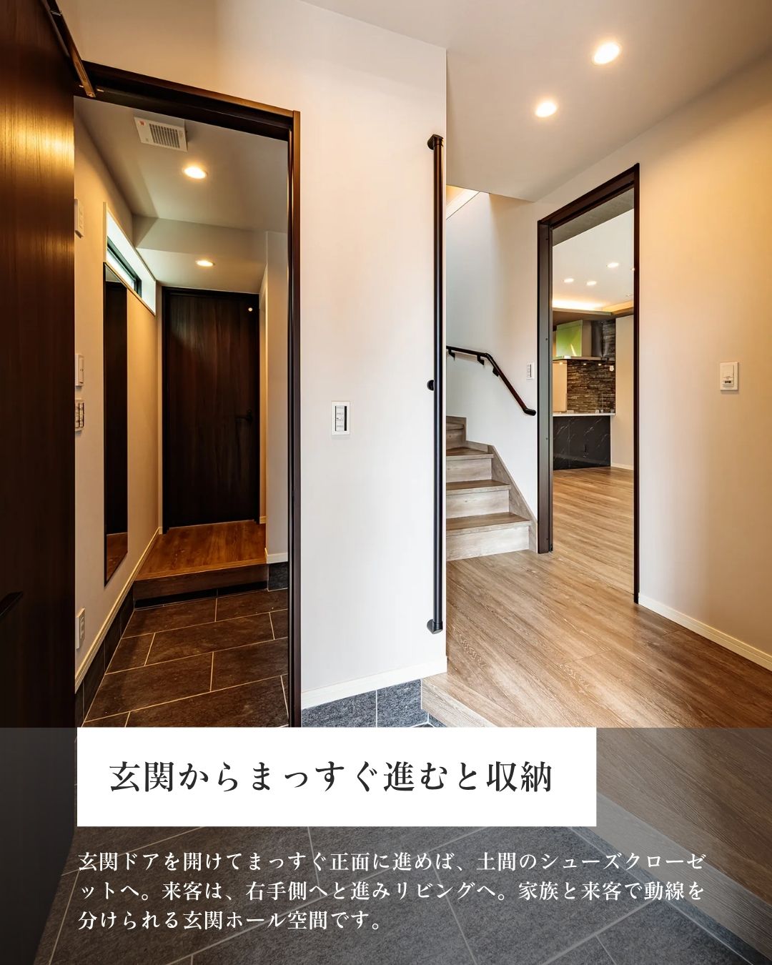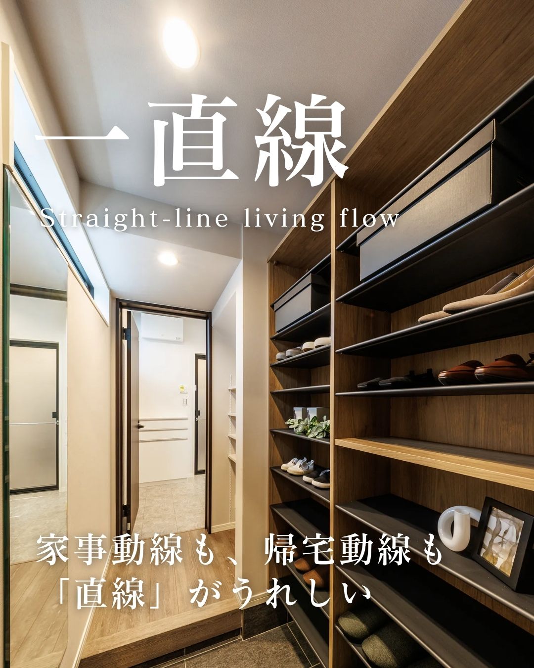 例えば、玉善の注文住宅でご提案している設計の一つに、 「玄関 → シューズクローク → 洗面 → 浴室 → そしてLDKへ」 と続く、一直線の生活動線があります。
