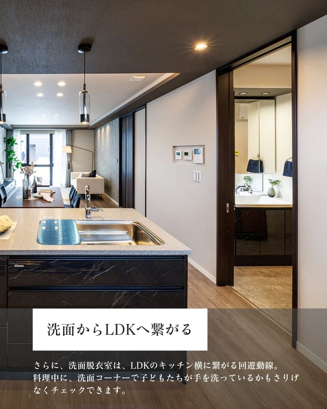 キッチンから洗面室が近ければ、お鍋を火にかけている間にサッと洗濯物を取り出せますし、行き止まりがないため、反対側から来た家族とぶつかることなくスムーズにすれ違えます。 朝の慌ただしい時間帯も、パパが洗面所を使い、ママがキッチンに立ち、お子様がLDKで遊んでいても、それぞれの動きが妨げられません。