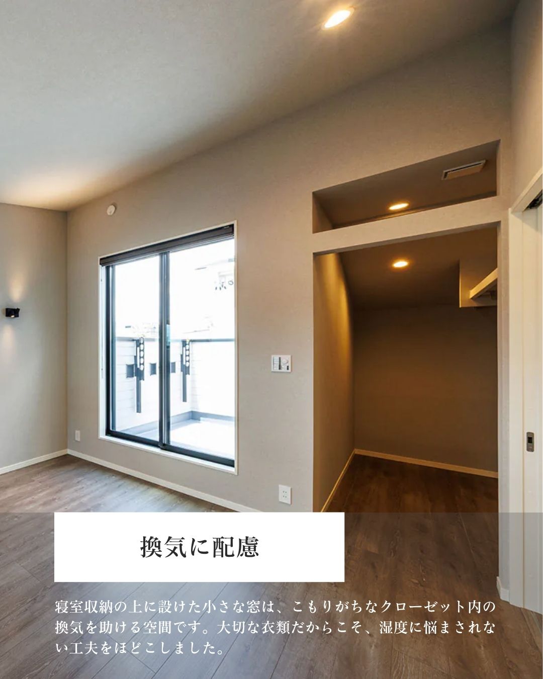 そこで私たちが取り入れたのが、収納上部に設けた「換気用の小窓」です。 写真をご覧いただくと、クローゼットの扉の上に小さな窓があるのがお分かりいただけると思います。この小窓が、こもりがちな空気をスーッと外へ逃がし、新鮮な空気を取り込む「呼吸する収納」を実現します。