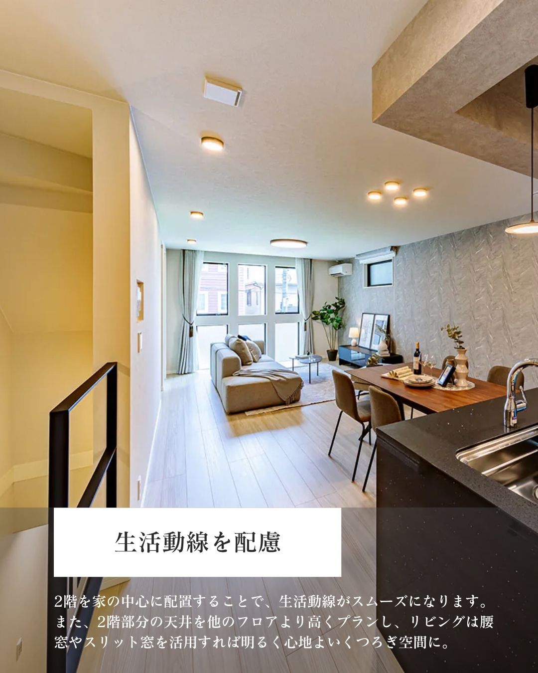ジャーッという炒め物の音を横目に、家族がリビングでくつろぐ。そんな「家族の気配」を常に感じられるのも、2階ワンフロアを贅沢に使ったLDKならではの魅力です。