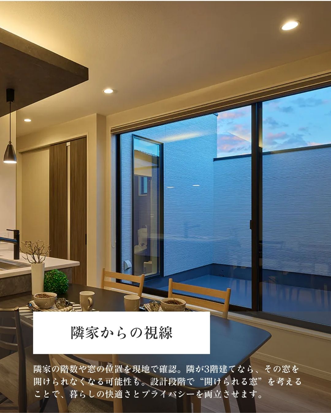 このように、現地で「隣家からの視線」や気配を徹底的にシミュレーションします。 例えば、中庭(パティオ)を囲むように壁を立ち上げる設計なら、街中は密集地であっても、一歩中に入れば別世界。 パジャマのままでも気兼ねなく朝食を食べたり、お子様がプール遊びをしていても外からの視線をシャットアウトできたり。 「開けられる窓」を設計段階で緻密に計算することで、プライバシーを守りつつ、光と風がスッと通り抜ける開放的な暮らしが実現します。