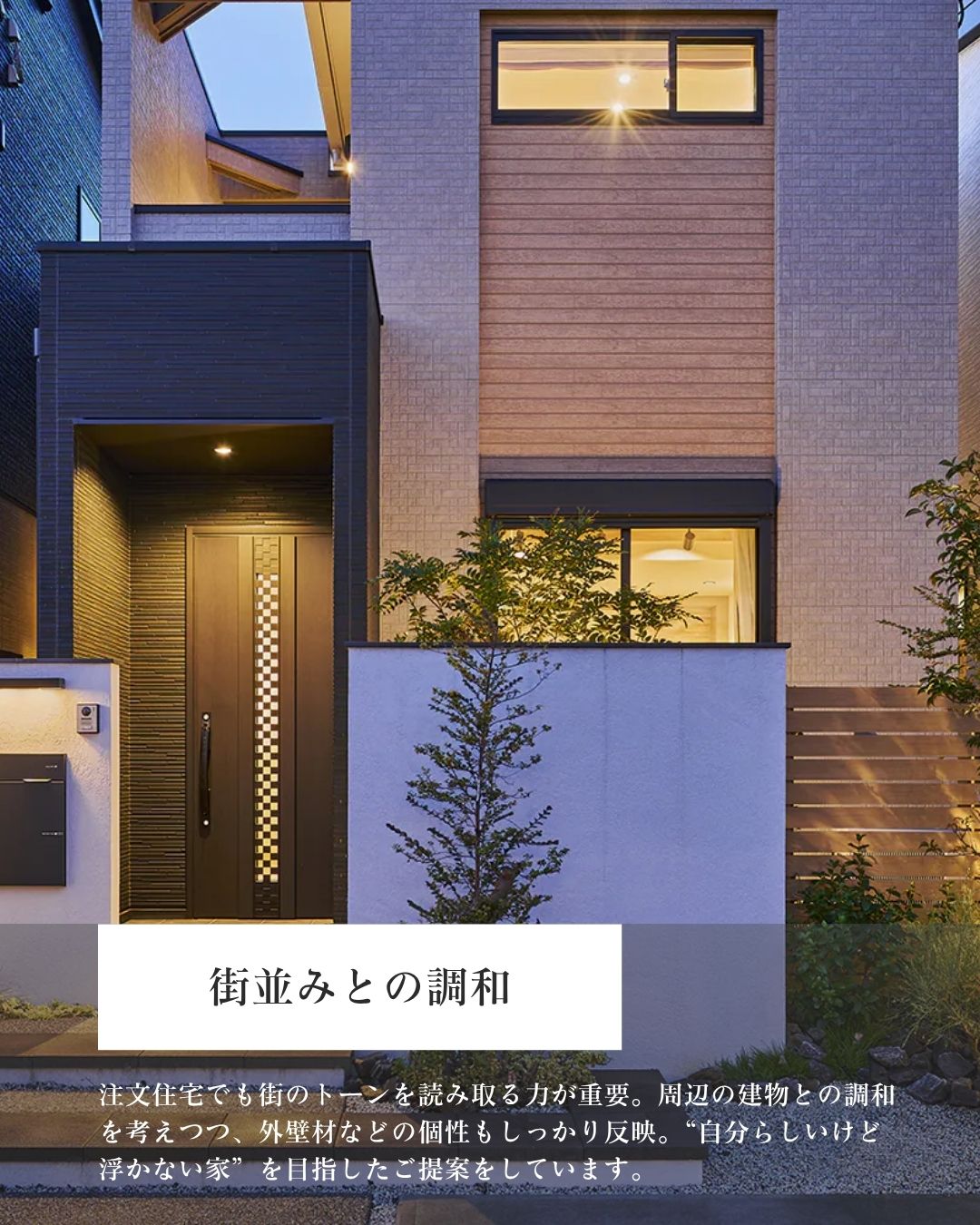 街並みのトーンを読み取りながら、外壁の素材や色味を調整する「街並みとの調和」も大切にしています。 「自分たちらしい個性」はしっかりと主張しつつも、決して街の中で浮かない。 年月が経つほどに植栽が育ち、街の風景の一部として馴染んでいく。そんな「資産価値」の高い佇まいを目指しています。