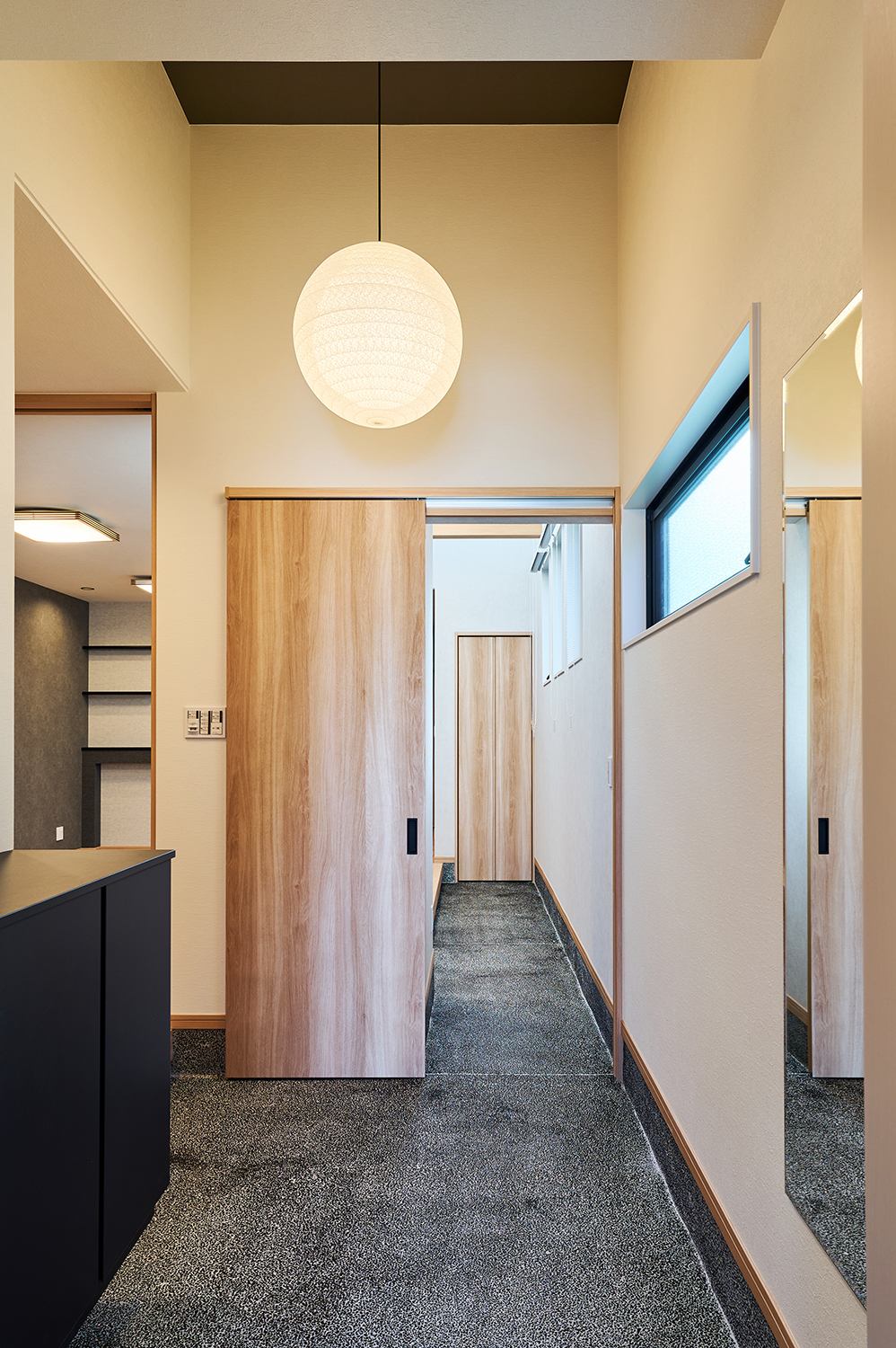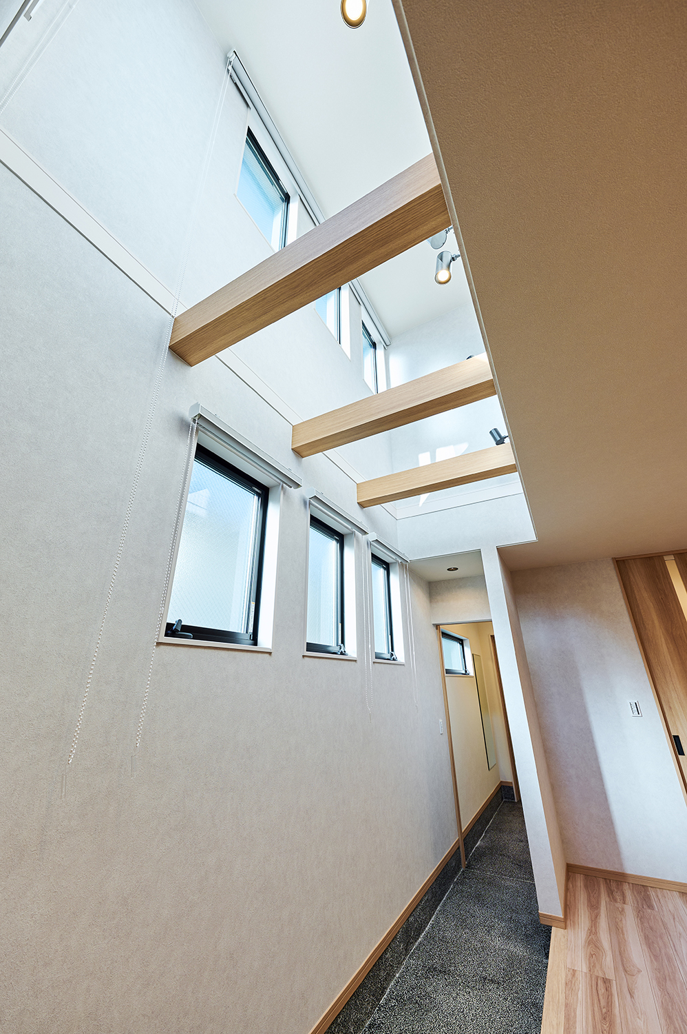 扉を開けると、上部吹き抜けから降り注ぐ光と圧倒的な開放感が出迎えてくれます。ホールを通る動線のほか、土間からリビングへ直結する2WAY動線を採用。2.5帖のゆとりある土間は、ベビーカーの直置きや雨の日の荷物整理など、多目的に使える実用的なスペースです。見上げれば木の温もりを感じる化粧梁が空間に心地よいアクセントを添え、外の喧騒を忘れて心がふわりと軽くなるような、穏やかで上質な空気感に包まれます。