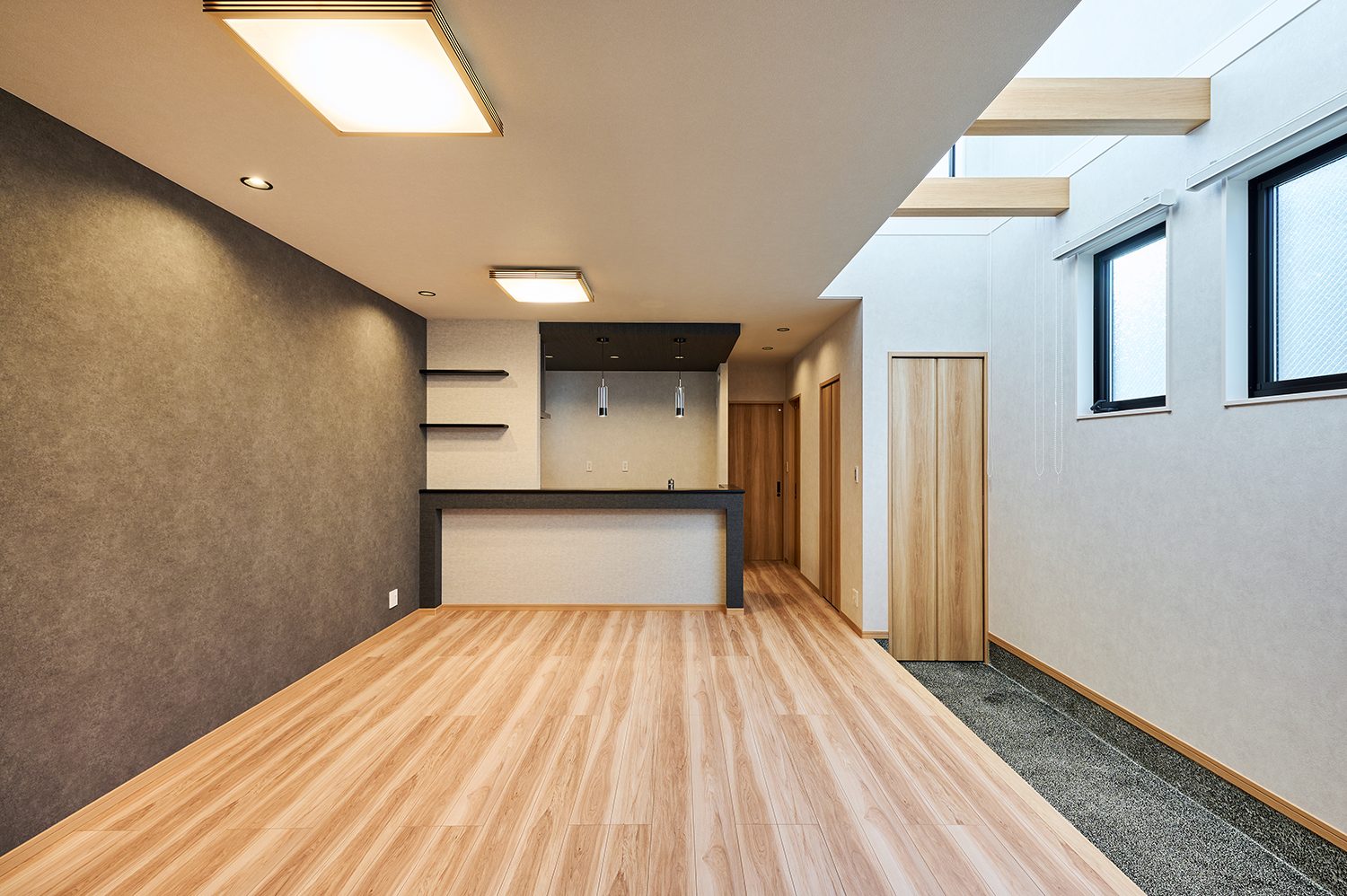 玄関の吹き抜けから届く光が、17帖のLDKを明るく、開放的に照らし出します。フロア全体を見渡せる対面キッチンは、お料理中も家族の存在を近くに感じられる安心の特等席。さらに、土間エリアとの視覚的な繋がりが空間に奥行きを与え、実面積以上のゆとりを演出します。木の温もりを感じる空間で、家族が自然と集まり、思い思いの時間をゆったりと共有できる住まいの中心です。