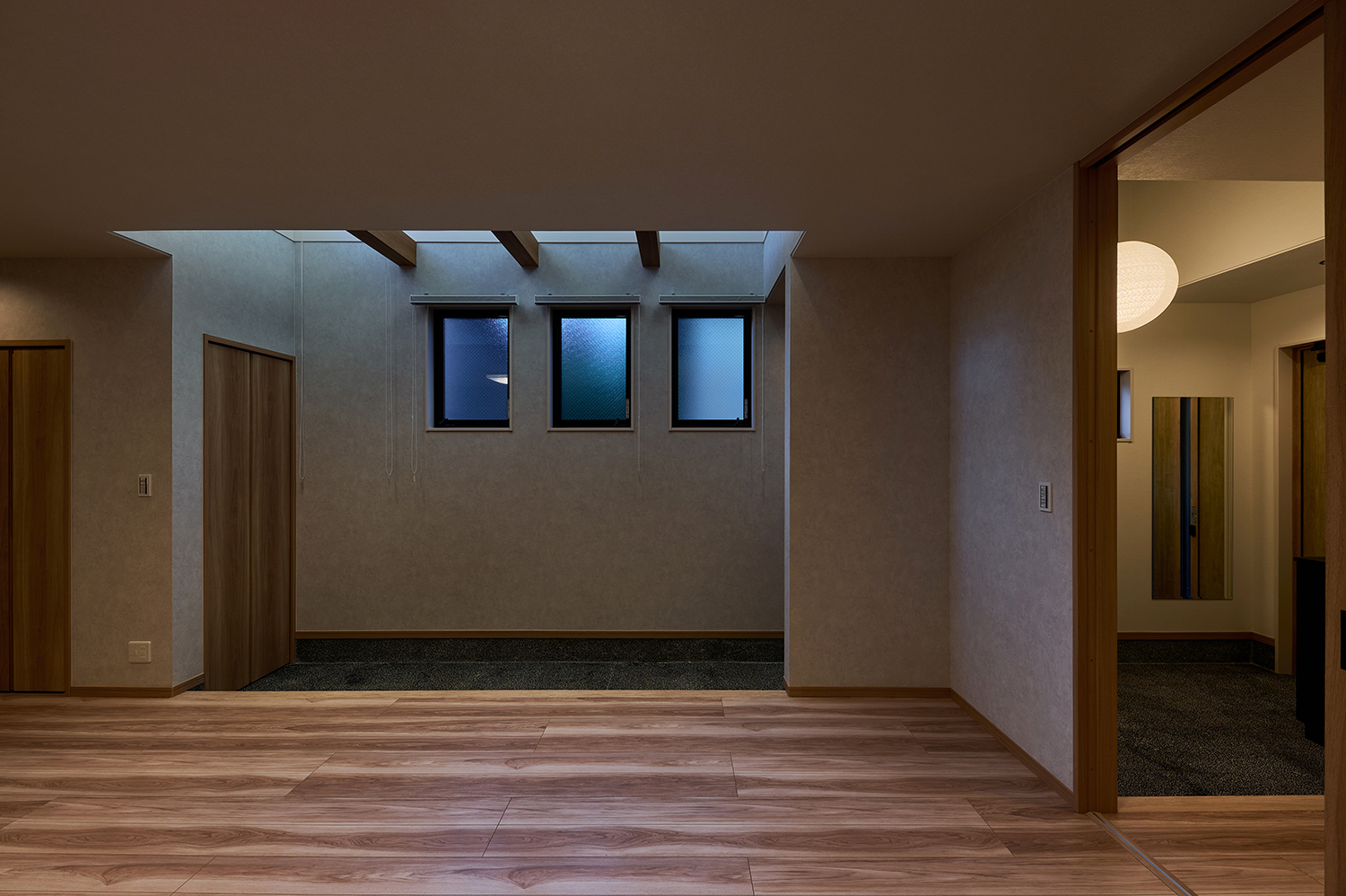 夜を迎えると、室内は照明が優しく灯る落ち着いた空間へと表情を変えます。吹き抜けの高窓から夜空を仰ぎ、化粧梁が描く陰影を眺めながら過ごす時間は、一日の疲れを癒やす特別なもの。夫婦でゆっくり会話を楽しんだり、家族で映画を観たり。開放感あふれるリビングが、夜には包み込まれるような安心感に満ちた、上質な家族の居場所になります。