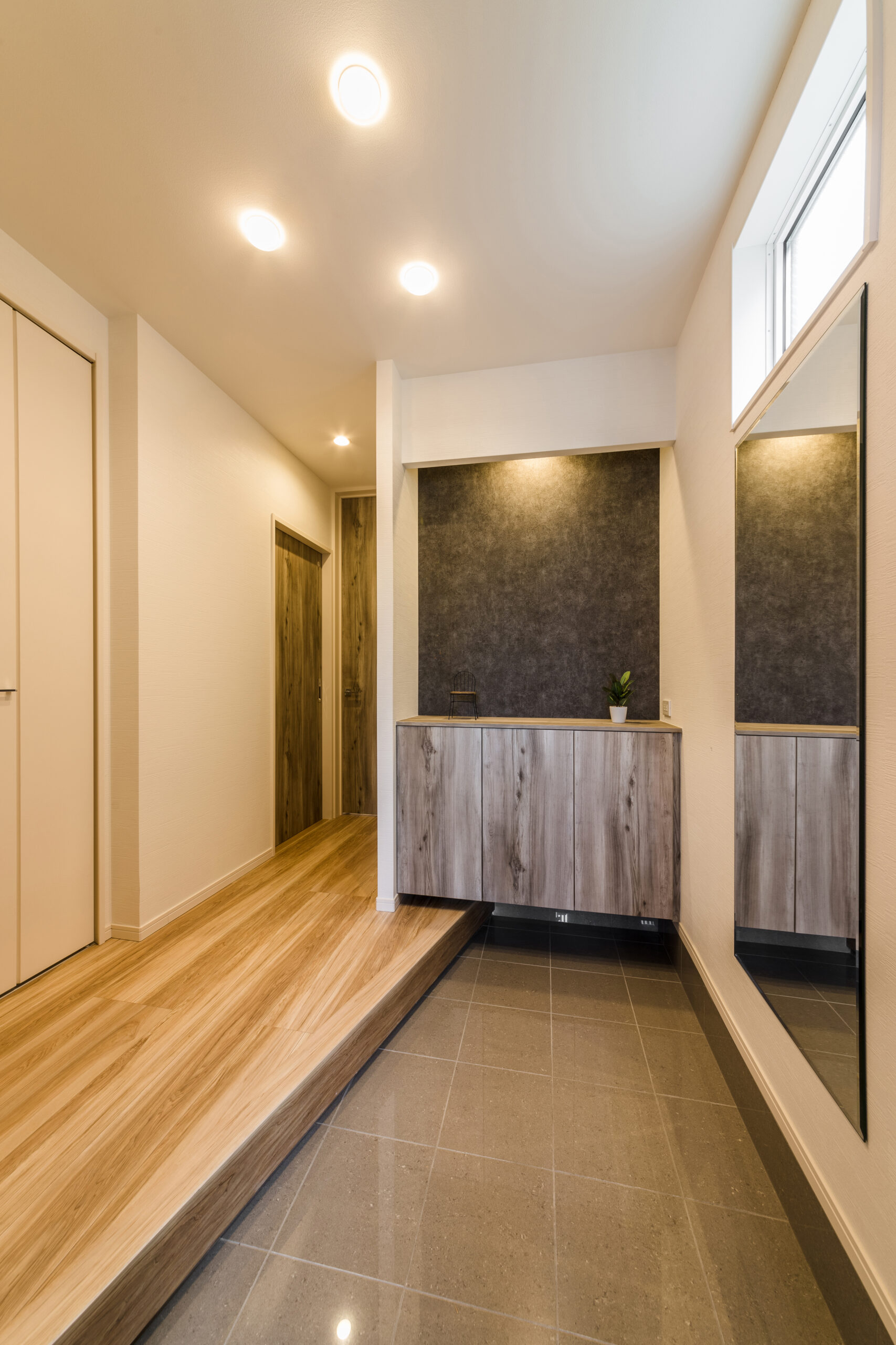 玄関ドアを開けて左手に廊下が広がる設計は、視線が奥へと抜けることで住まいに心地よいゆとりをもたらします。ホールに上がってすぐの場所には、扉で隠せる大容量のシューズインクロークを配置。外出時に使う小物や予備の靴などを居住スペースに持ち込まずに仕舞えるため、室内を常に美しく保つことができます。一歩足を踏み入れた瞬間、自分たちが一番に心からリラックスできる、整理された住まいの顔を実現しました。