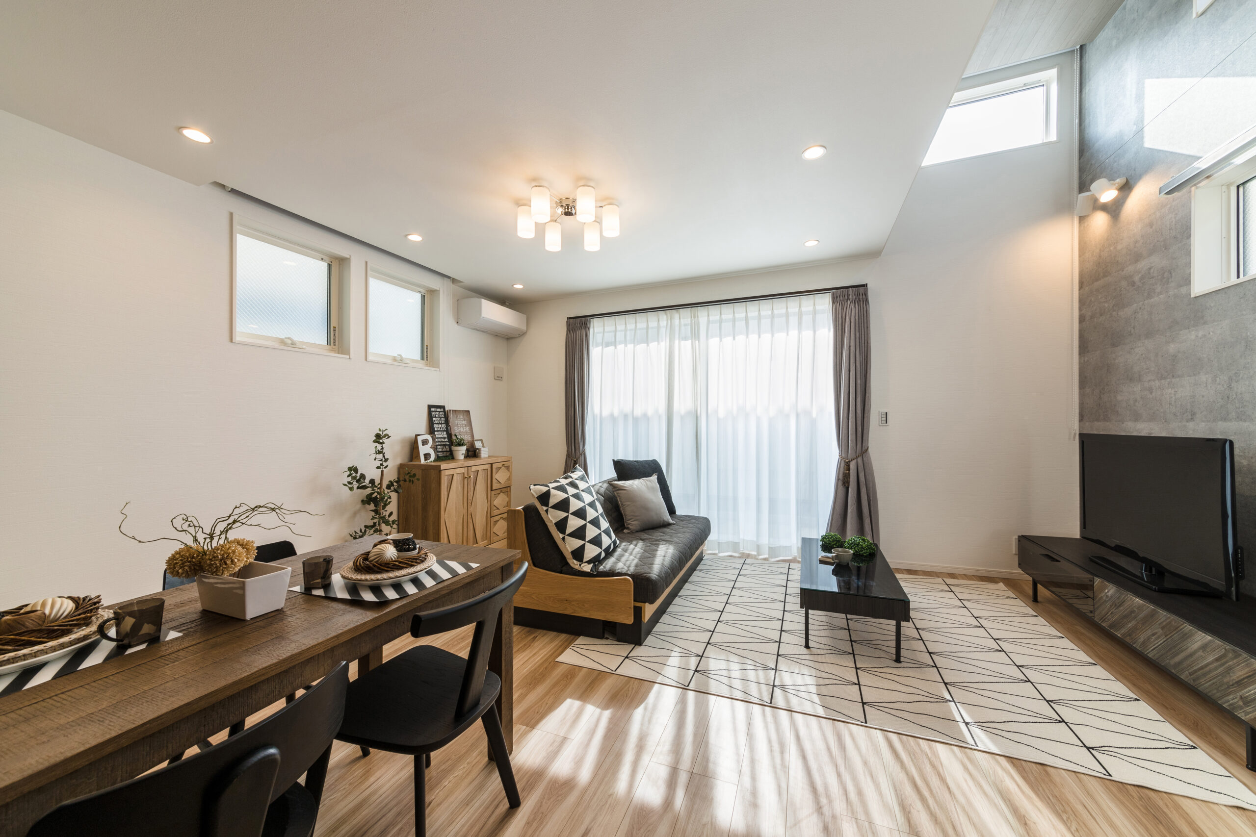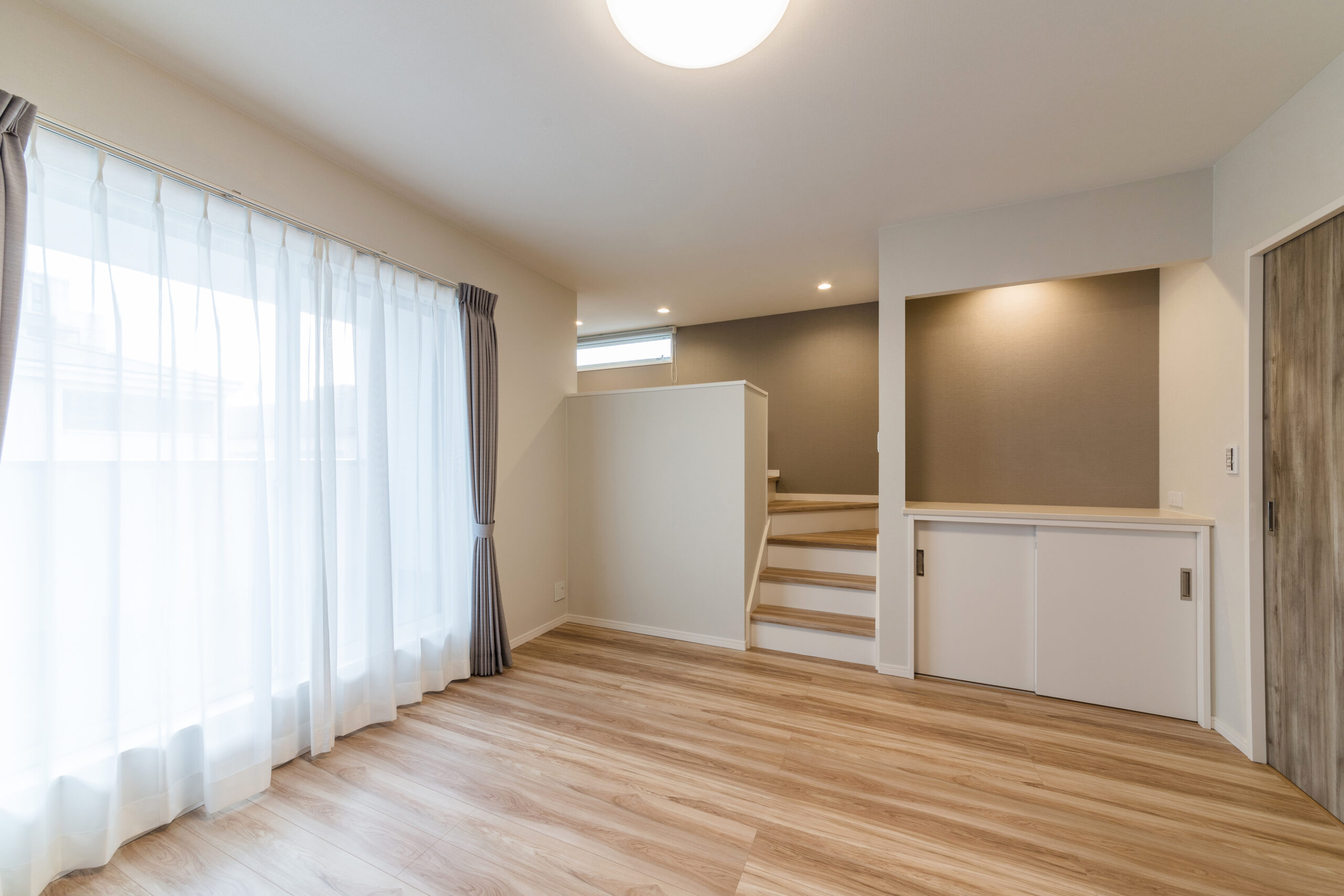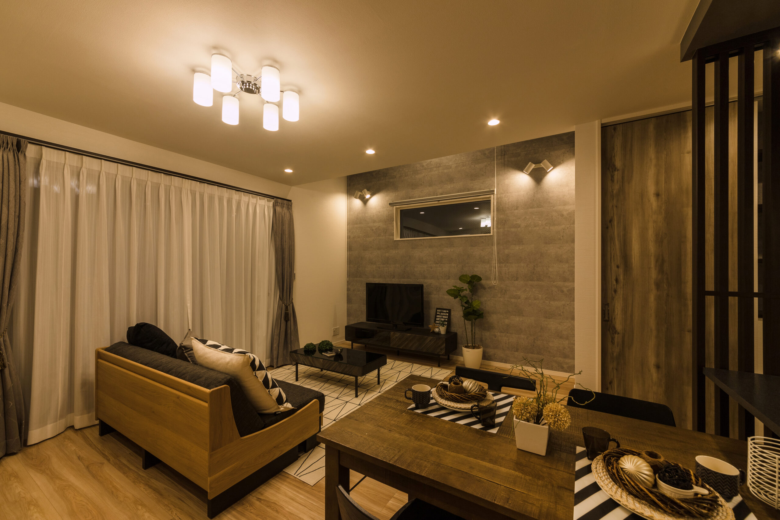 リビングは上部を吹き抜けにすることで、縦方向への伸びやかな開放感を存分に味わえる空間となっています。テレビボード側の壁面には、落ち着いた素材感のあるグレーのアクセントクロスを採用。夜には壁面のブラケットライトから漏れる柔らかな光が壁に広がり、空間全体を穏やかな雰囲気で包み込みます。時間の移ろいとともに光の表情が変わるリビングは、家族が自然と集まり、一日の終わりを静かに過ごせる居場所です。