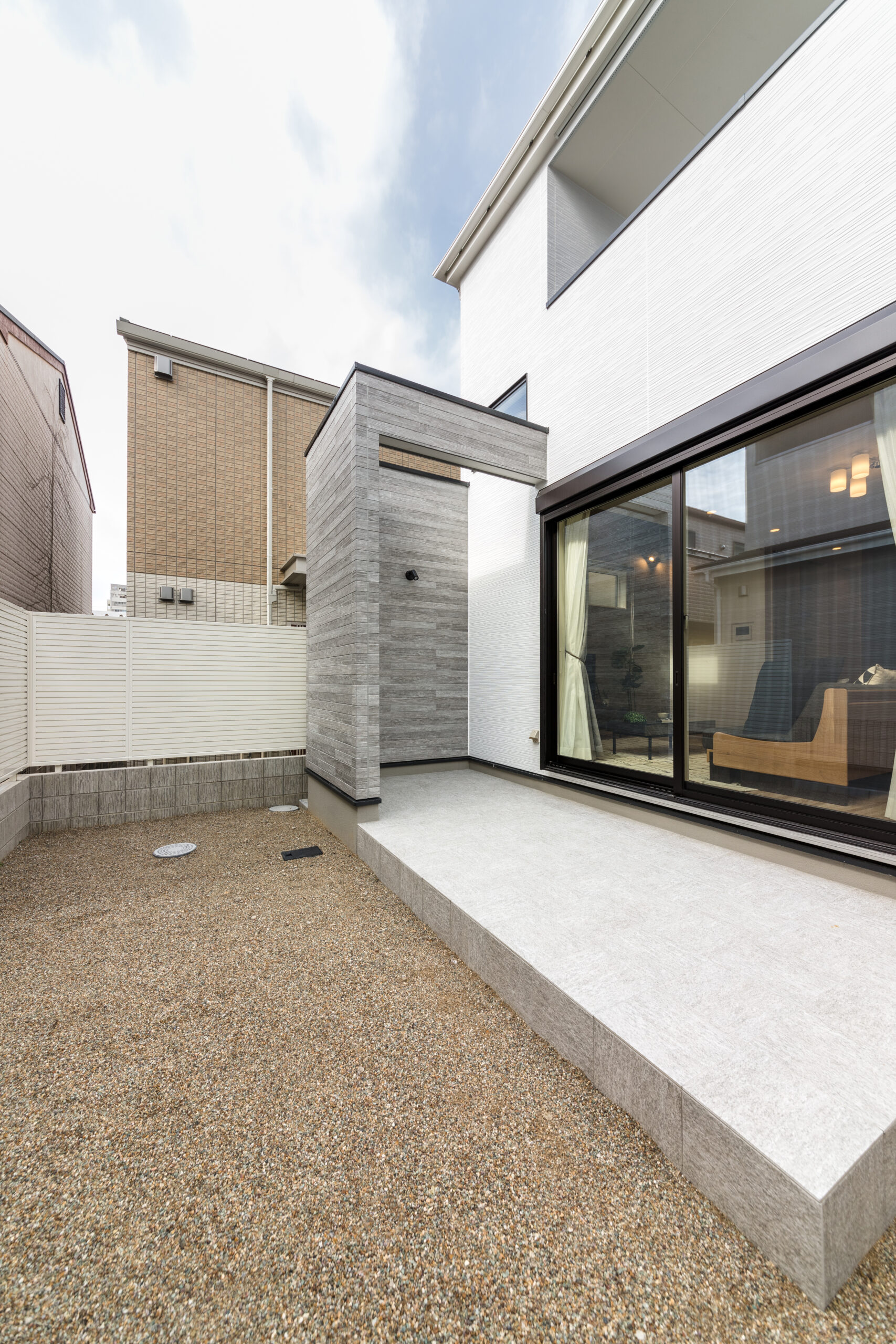 リビングの大きな掃き出し窓からフラットに繋がるタイルテラスは、室内が外へと延長されたような開放感をもたらします。落ち着いたトーンのタイルは上質な風合いがあり、窓を開ければ家中を爽やかな風が通り抜けます。周囲の視線を遮りつつ、植栽の緑を身近に感じられるプライベートな設計。週末に椅子を出して読書を楽しんだり、外の空気を日常的に取り入れたりと、家の中にいながら外の心地よさを素肌で感じられる場所です。