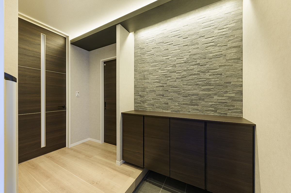 玄関。「帰ってきた」と感じる、落ち着きのある顔 扉を開けると、間接照明に照らされた石目調のアクセントウォールが目に入ります。華美な装飾ではなく、素材そのものの表情で上質さを表現した空間は、訪れる人にも、毎日帰ってくる家族にも、静かな安心感を与えてくれます。