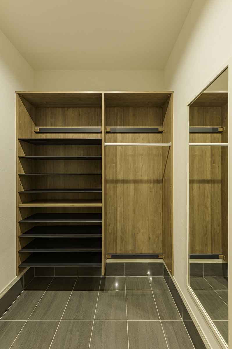 隣接するシューズクロークは、姿見を備えた使い勝手のよい設計。家族それぞれの靴はもちろん、傘やアウトドア用品なども収まり、玄関はいつもすっきりとした状態を保てます。「行ってきます」の前に身だしなみを整えられる、小さいけれど毎日使う便利さです。