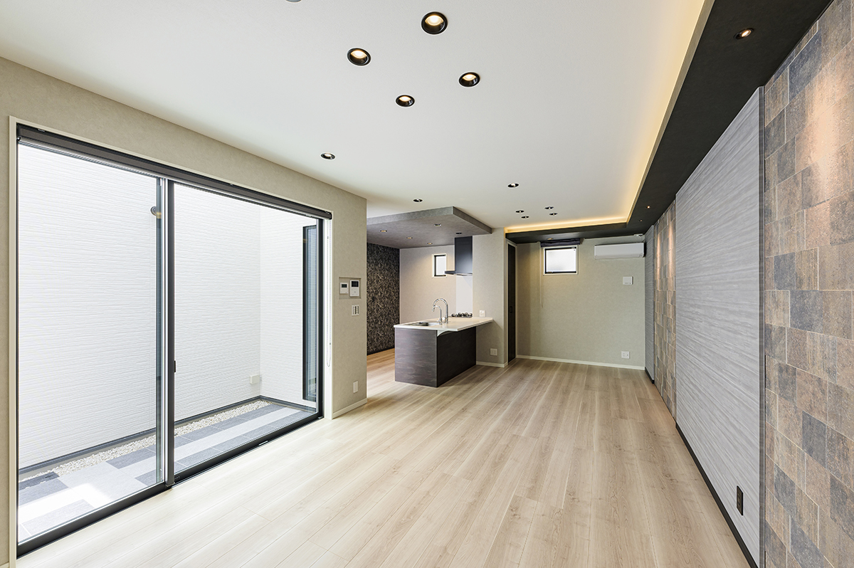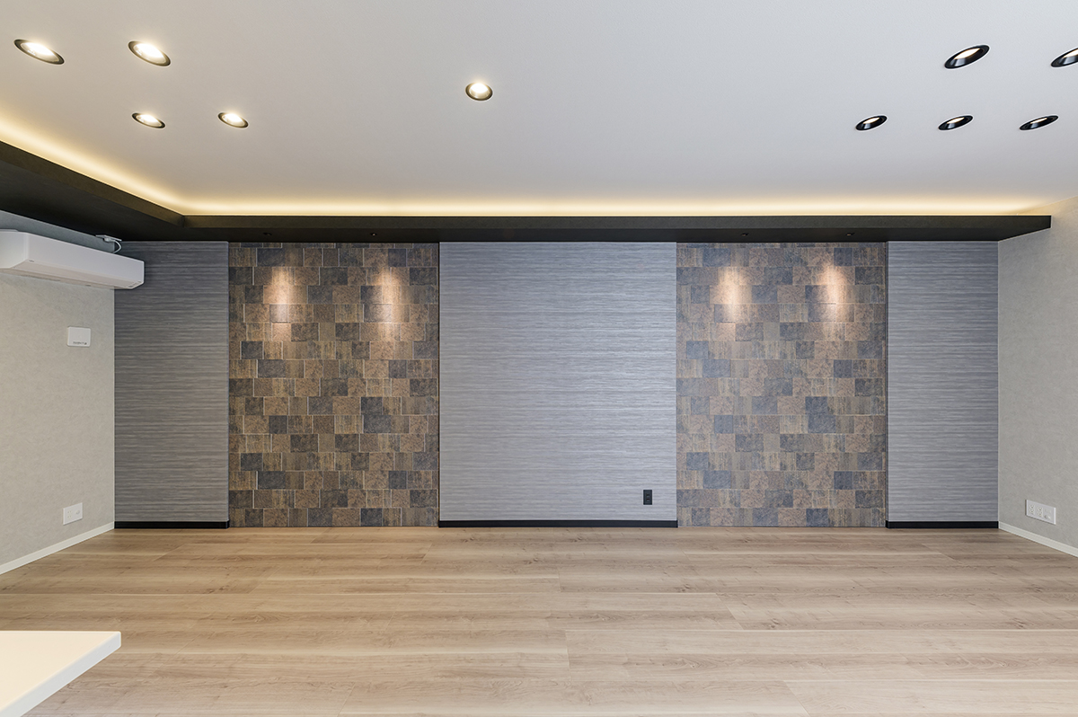 LDK。18帖超の広さと、夜が美しい空間設計 天井高2.5mを確保した18帖超のLDKは、自然な木目調のフローリングと、壁一面に広がる重厚な石目調アクセントウォールが印象的な空間です。モダンでありながら、どこか温かみがあり、家族それぞれが自分の居場所を見つけられるような包容力があります。 特に夜、間接照明とスポットライトが壁の凹凸に陰影を生み出す瞬間は、この家ならではの豊かさです。食後のソファでくつろぎながら、その壁をぼんやり眺める。そんな何気ない時間が、日々の疲れをほぐしてくれます。