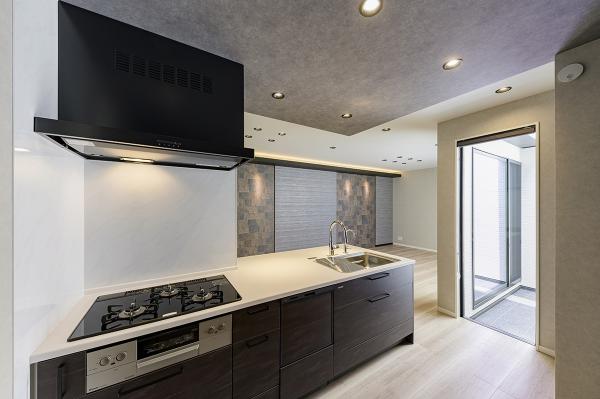 キッチン。料理に集中できる、機能美のある設計 存在感のあるキッチンは、広い天板と使いやすい収納が揃った実用的な設計です。コンロ前には壁を設けることで、油はねを気にせず調理に集中できる工夫も。天板には耐久性に優れた人造大理石を採用し、清潔感と高級感を長く保てます。 ダークブラウンのキャビネットとグレーの天井が、LDKのアクセントウォールと自然に調和し、キッチンに立つ時間そのものをインテリアの一部にしてくれます。