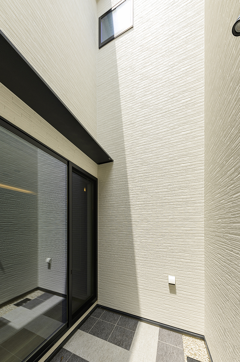 テラス。外に出るほどでもない、でも外の空気を感じたい リビングからフラットにつながるテラスは、周囲の視線を遮った、家族だけのプライベートな外空間です。広い庭ではありませんが、だからこそ使いやすい。朝のコーヒーを一杯、夕涼みに少し外の風を感じる。そういった、日常のなかのちいさな贅沢を支えてくれる場所です。