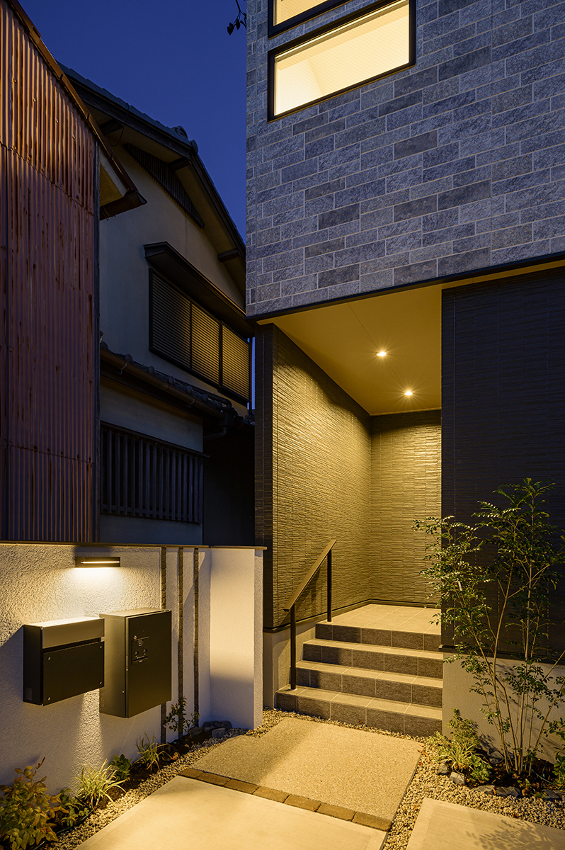 夜になると、門まわりに灯る柔らかな照明が外壁の素材感をより豊かに引き立て、帰宅するたびに「ただいま」と言いたくなるような、温かな雰囲気を演出します。