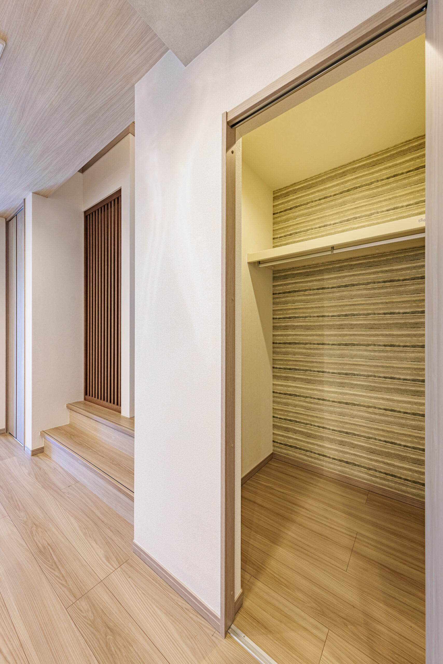 リビング横に収納があるだけで、朝の支度がスムーズになります。